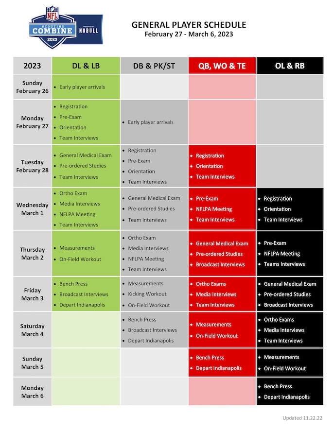 Dies soll kein Artikel werden, sondern eher ein Informationspost. Vom 28.02.2023 bis 05.03.2023 findet der NFL Combine statt. Die praktischen Übungen starten ab Donnerstag. Die einzelnen Positionsgruppen sind auf die verschiedenen Tage unterteilt. Die Teams können auch Interviews mit den Prospekts durchführen. 60 Interviews sind pro Team erlaubt.